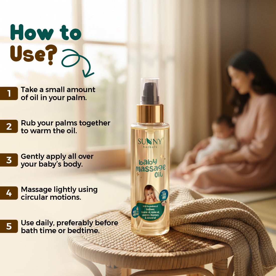 A nourishing blend of Sunflower Oil, Sesame Oil, Jojoba Oil, Almond Oil, Lavender, Rosemary, and Cow Ghee—carefully chosen to gently moisturize, soothe, and protect your baby’s delicate skin.